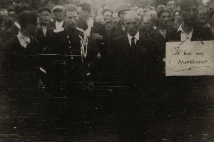 Bij hun poging, begin mei 1945, als ze samen, tussen talloze arbeidsslaven anoniem en ongezien de grens bij Denekamp proberen over te komen, worden Dirk Johannes Kip en zijn vader Arnold, door een grenswachter herkend en vervolgens gearresteerd en overgebracht naar de marechaussee kazerne te Ootmarsum. Op weg daar naar toe krijgt Dick Kip een bord omgehangen met daarop de tekst “Ik ben een moordenaar”. Veel mensen jouwen de twee uit met alle verwensingen die men zich maar kan bedenken. De gezichtsuitdrukkingen van de omstanders op de foto spreken boekdelen